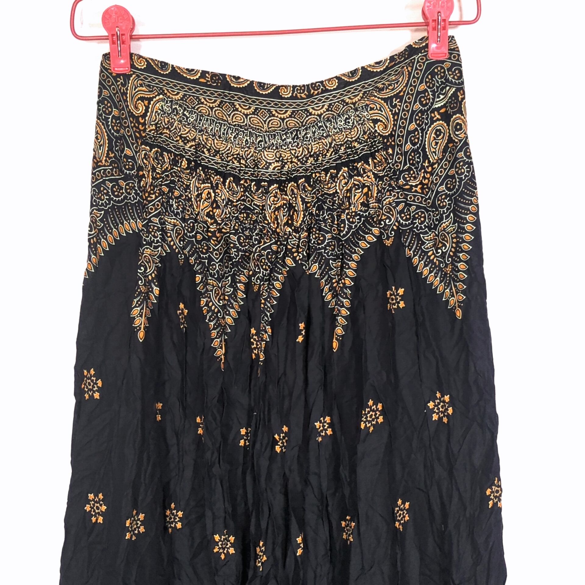こちらは、薄手のレーヨン100%で作られたタイパンツのキュロットタイプです。ウエストの後ろがゴム仕様です。軽やかな素材感で、レイヤードスタイルにもぴったりなアイテムです。カジュアルなスタイルを楽しみたい方におすすめ!歩くとゆらゆらするシルエットが素敵です。