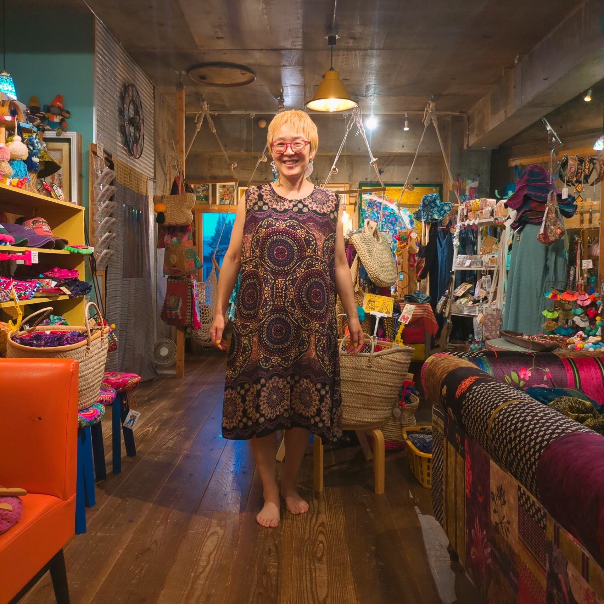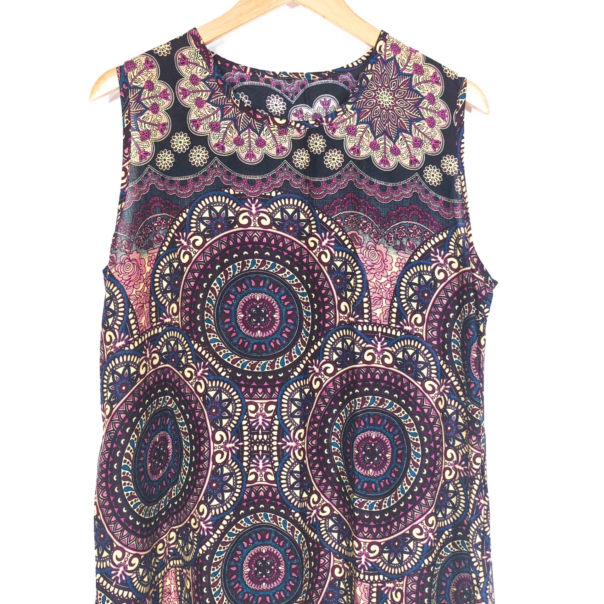 こちらは、曼荼羅柄が魅力的なノースリーブワンピースです。レーヨン100%の素材で作られており、軽くて涼しい着心地が特徴です。夏の暑い日でも心地よく過ごせるアイテムです。エレガントでありながらカジュアルな雰囲気も持ち合わせているため、様々なシーンで活躍します!