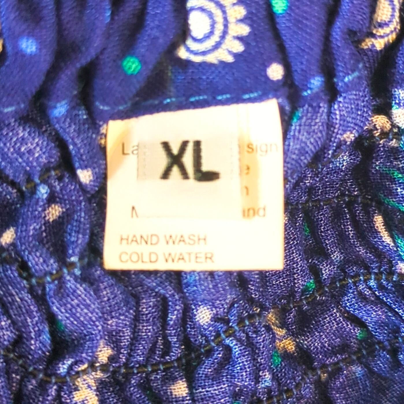 こちらは、華やかな青のクジャク柄が魅力的な大き目サイズのスリットパンツです。両サイドに切れ込みがあり, お尻側からの布が前側の布を外側から覆ってある形状で歩いたりするとヒラヒラ揺れたり少し開いたりとても可愛くタイパンツの中でも人気の高いタイパンツです!