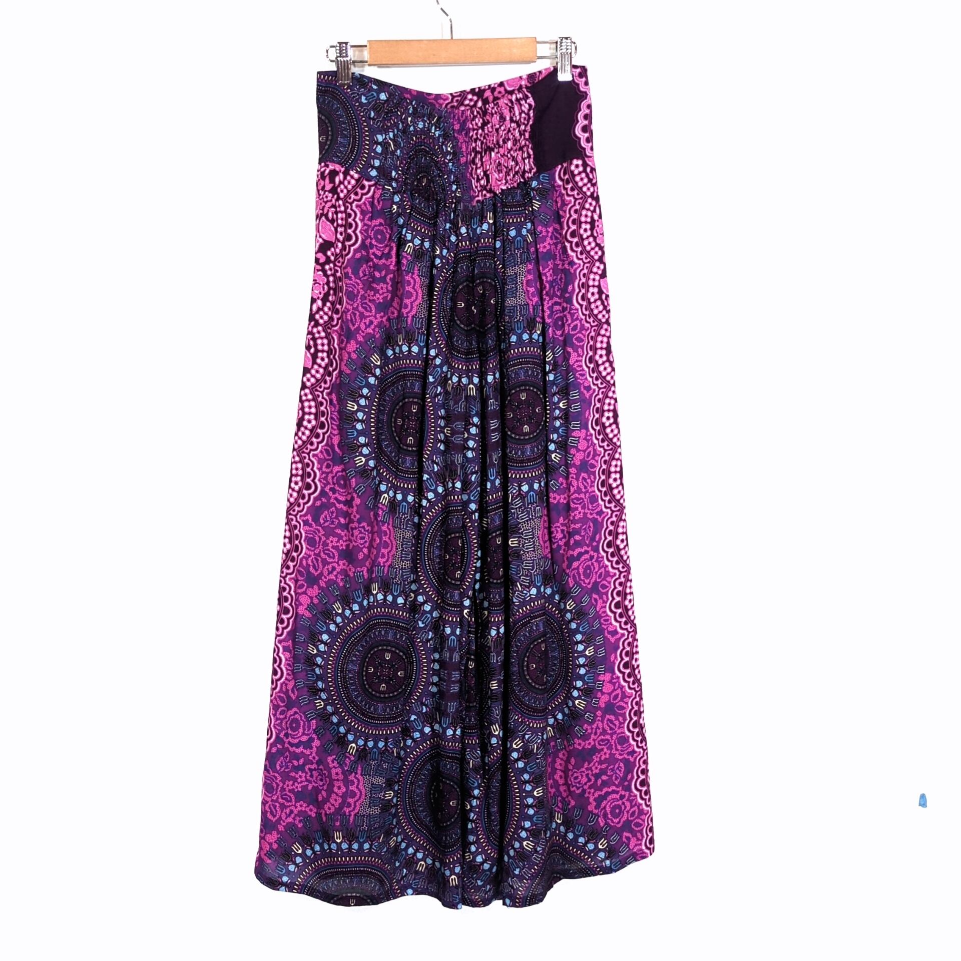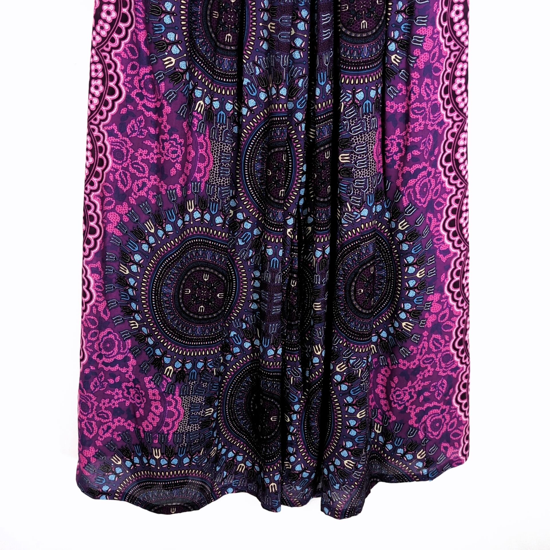 こちらは、優雅な曼荼羅柄が目を引くスリットパンツです。両サイドに切れ込みがあり, お尻側からの布が前側の布を外側から覆ってある形状で歩いたりするとヒラヒラ揺れたり少し開いたりとても可愛くタイパンツの中でも人気の高いタイパンツです!