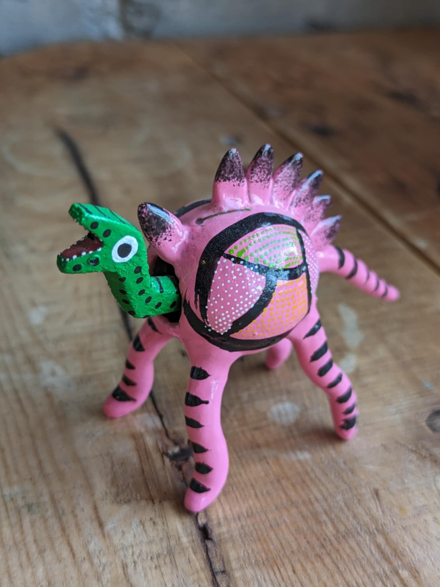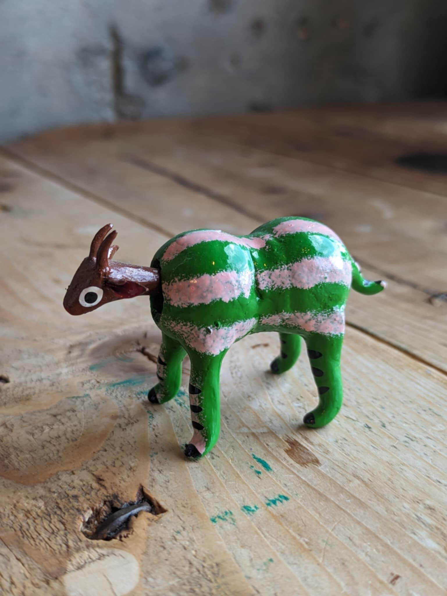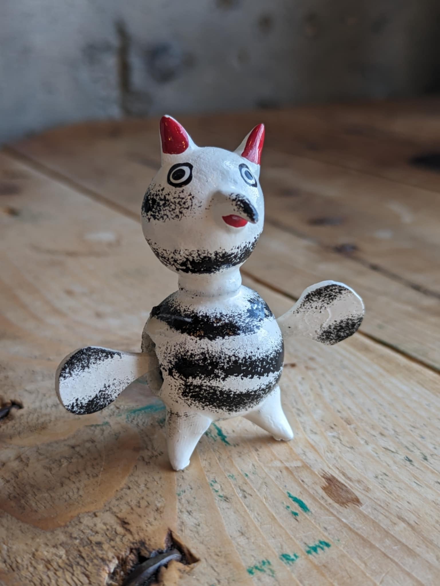 頭や手やしっぽがゆらゆら揺れるカラフルな置物です